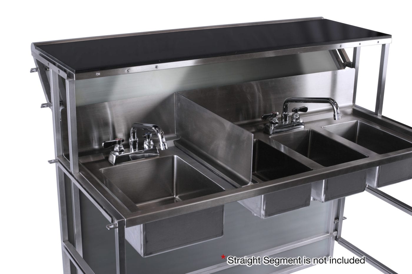 The Portable Bar Company is proud to offer a commercial grade, stainless steel four basin sink that fits into the popular Flash Bar Modular System. Implement the best practice of a three basin wash, rinse, sanitize process with the added convenience of a hand washing station. A six inch partition divides the hand washing basin from the dishwashing basins to prevent cross contamination. This sink kit allows you to connect your own plumbing system.