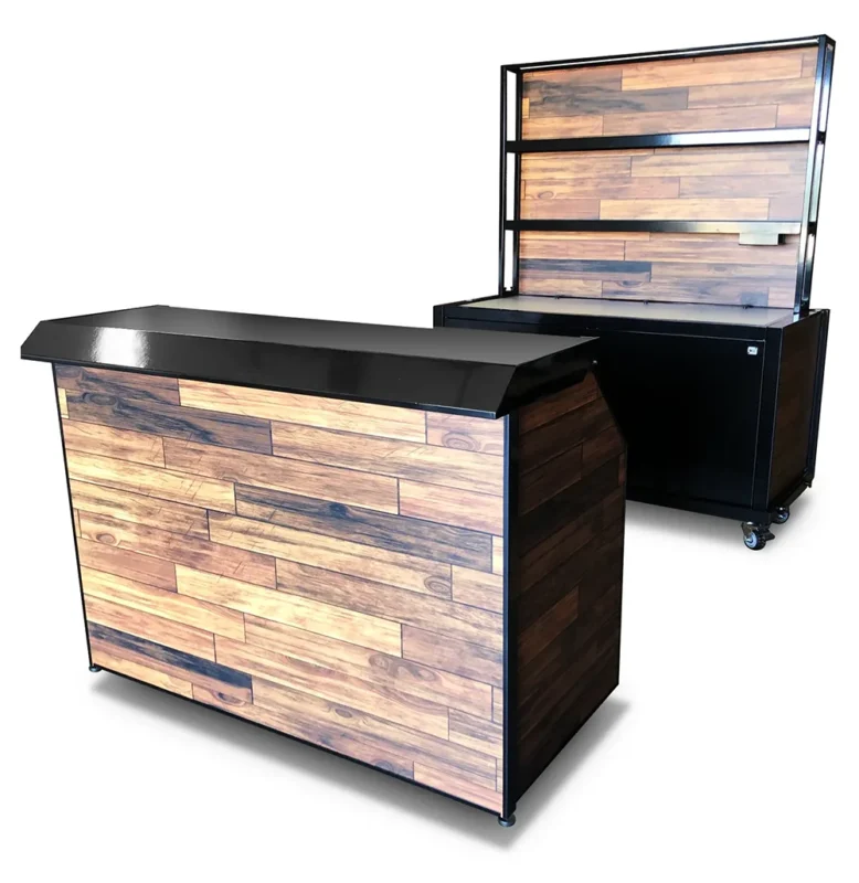 Customize our commercial portable bars with full-color graphics & laminates to personalize a client’s special day, add a company logo, promote a product launch, or match interior decor.