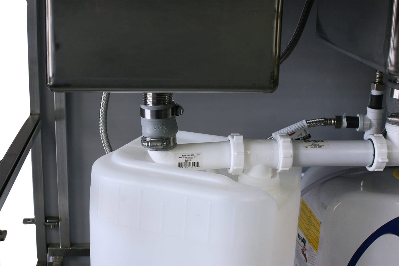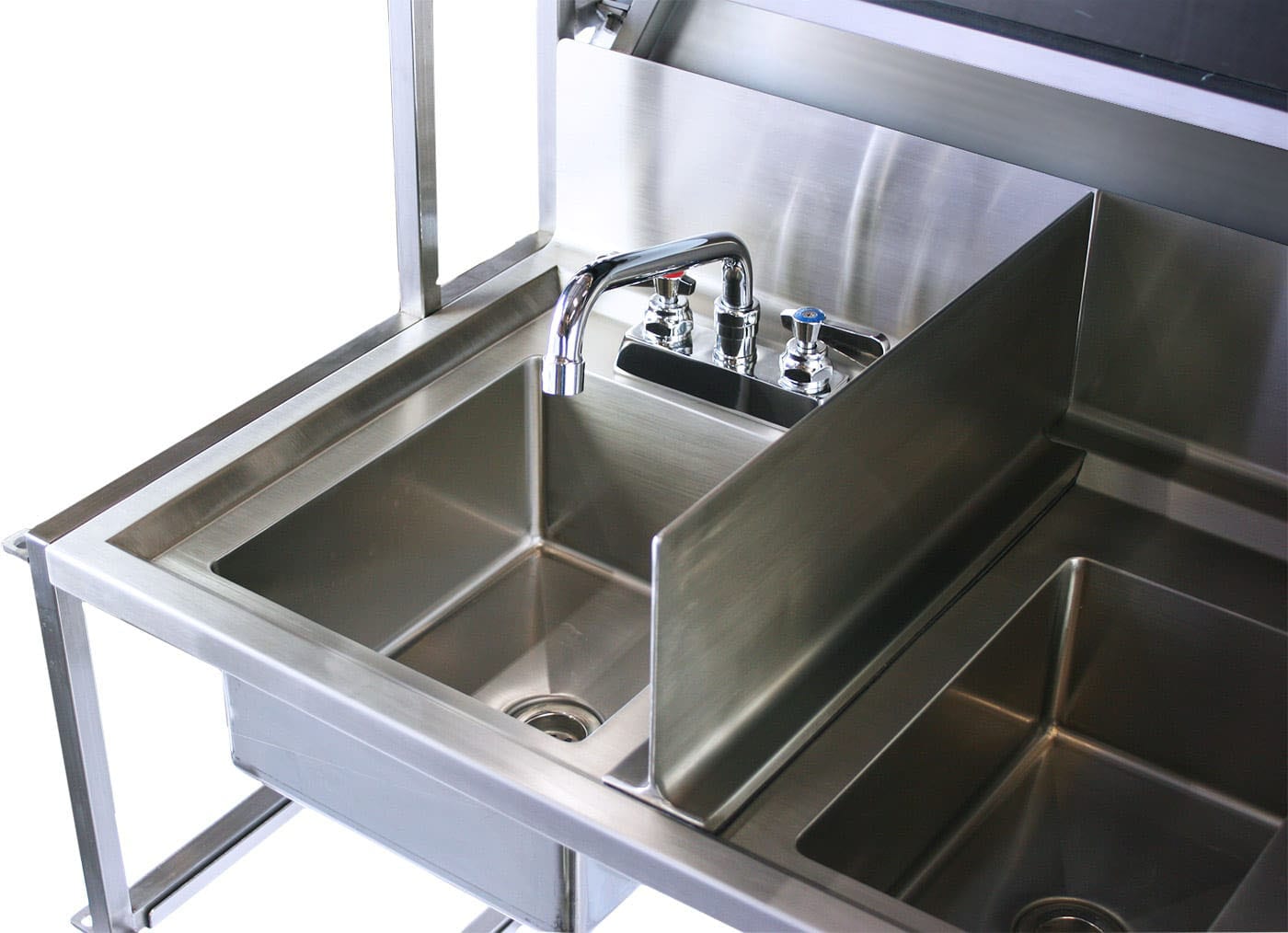 The Portable Bar Company is proud to offer a self contained, commercial grade, stainless steel four basin sink. It fits into the popular Flash Bar Modular System so bartenders and bussers can use the three basin wash, rinse, sanitize process. The 4 Basin Sink provides the added convenience of a hand washing station. A six inch partition divides the hand washing basin from the dishwashing basins to prevent cross contamination. The included plumbing system creates a fully self contained solution for venues and events.