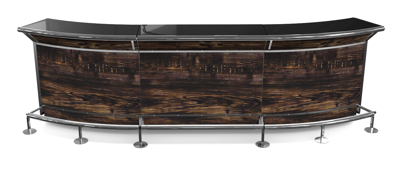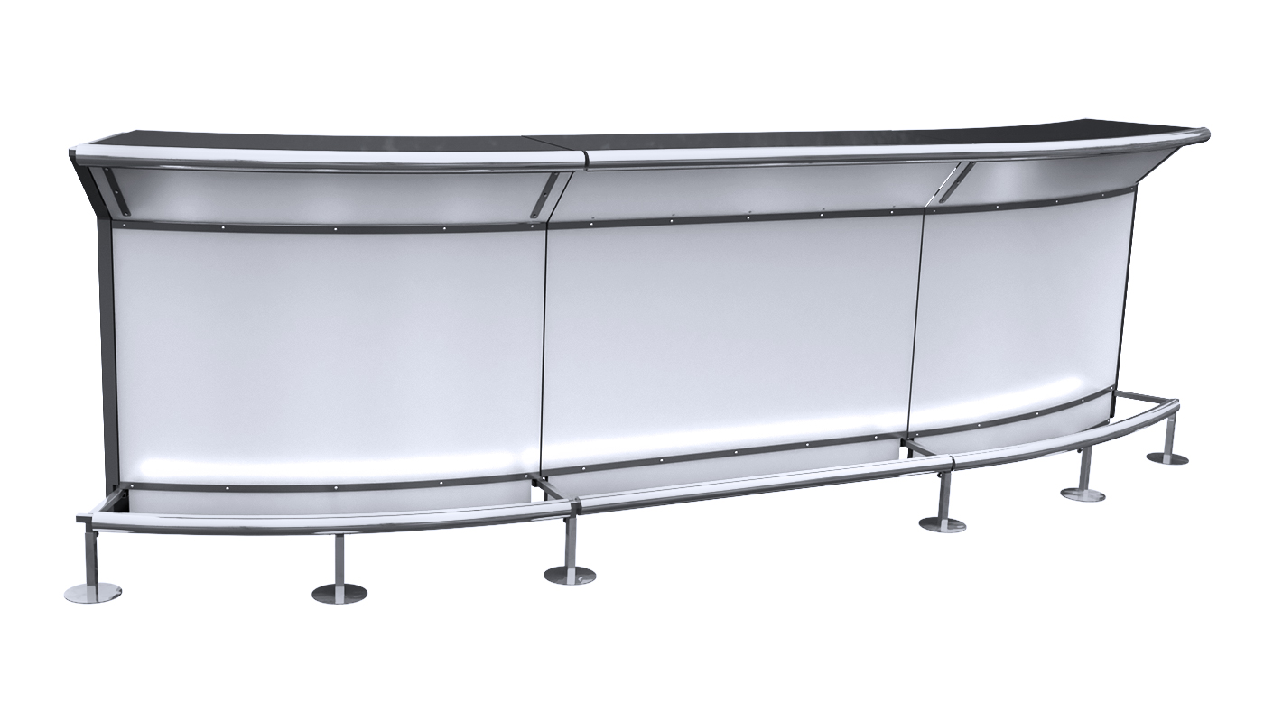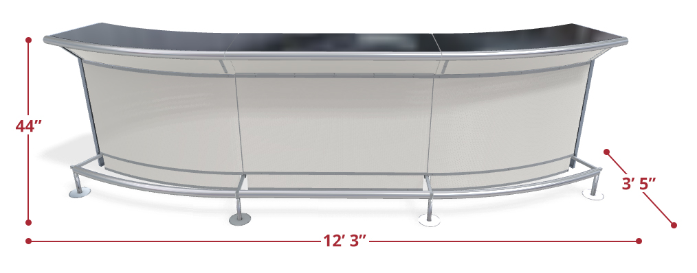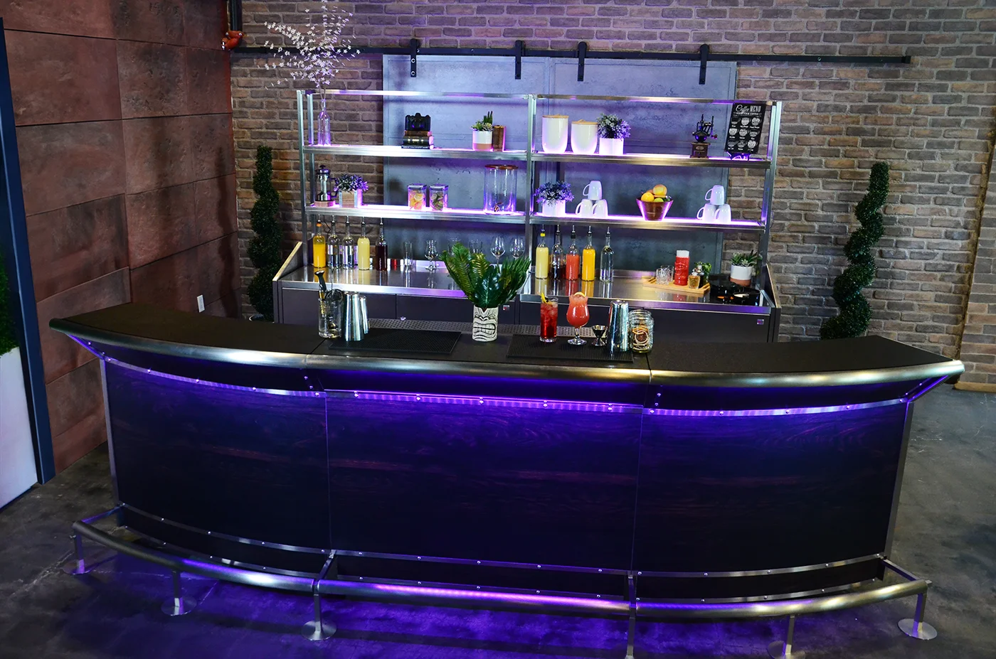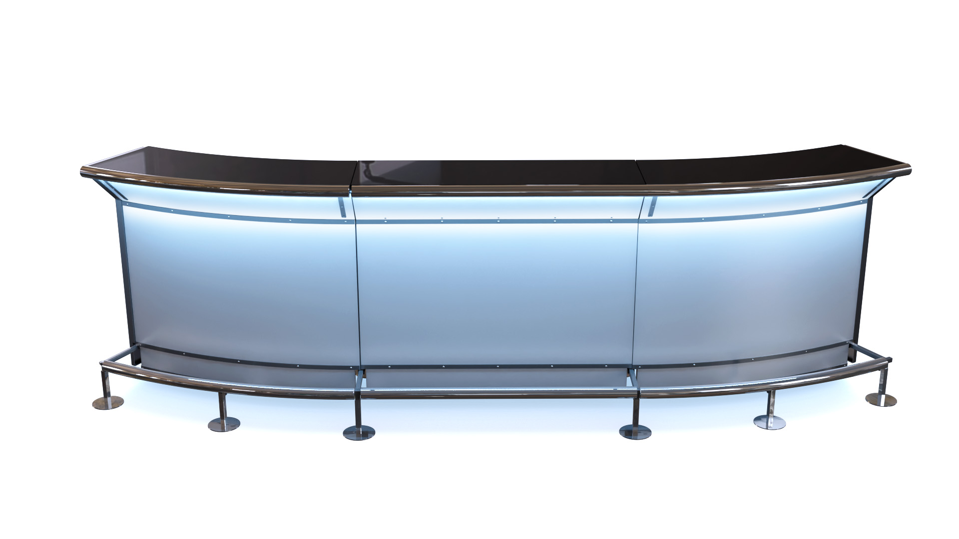 The Illuminated Slightly Curved Bar is meant to stand out. It is an unmissable 12 feet 3 inches long while the slight curve turns up the sophistication. It offers ample storage space and works well as a wine bar for weddings and corporate events.