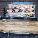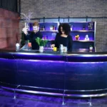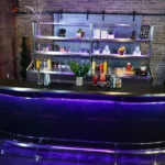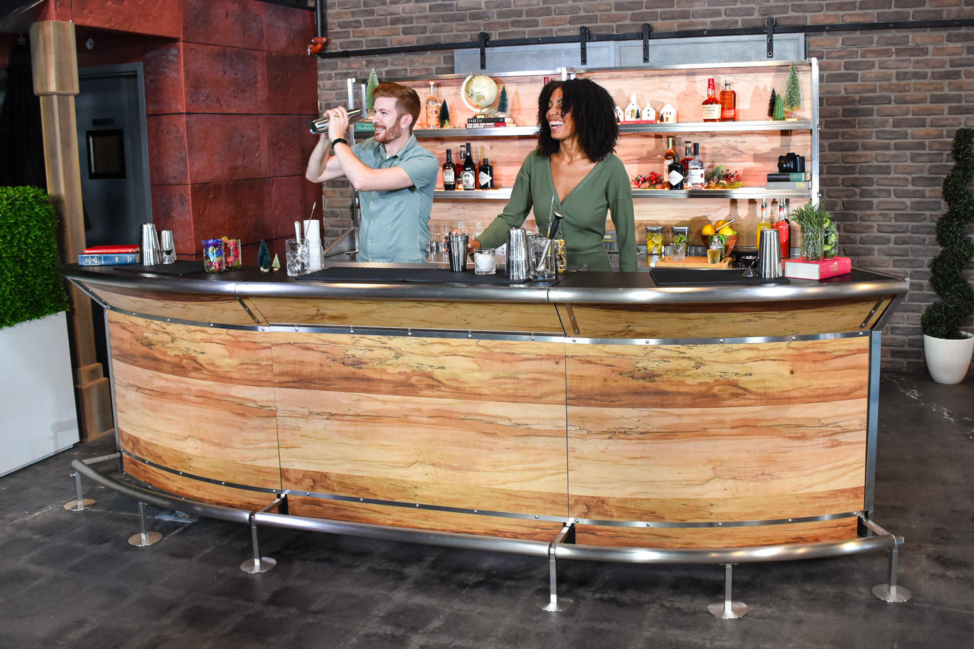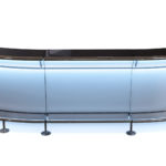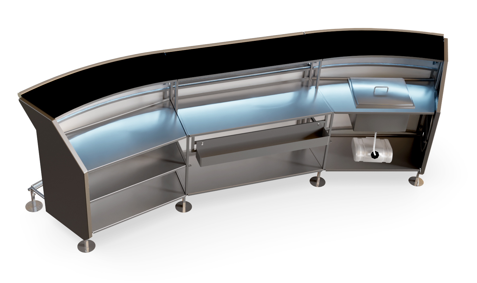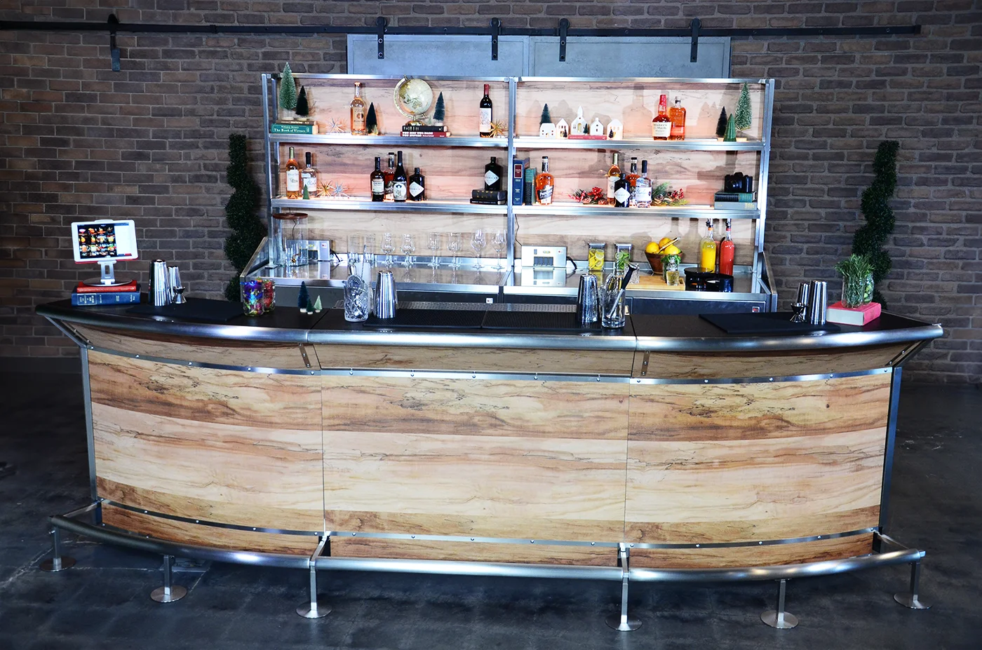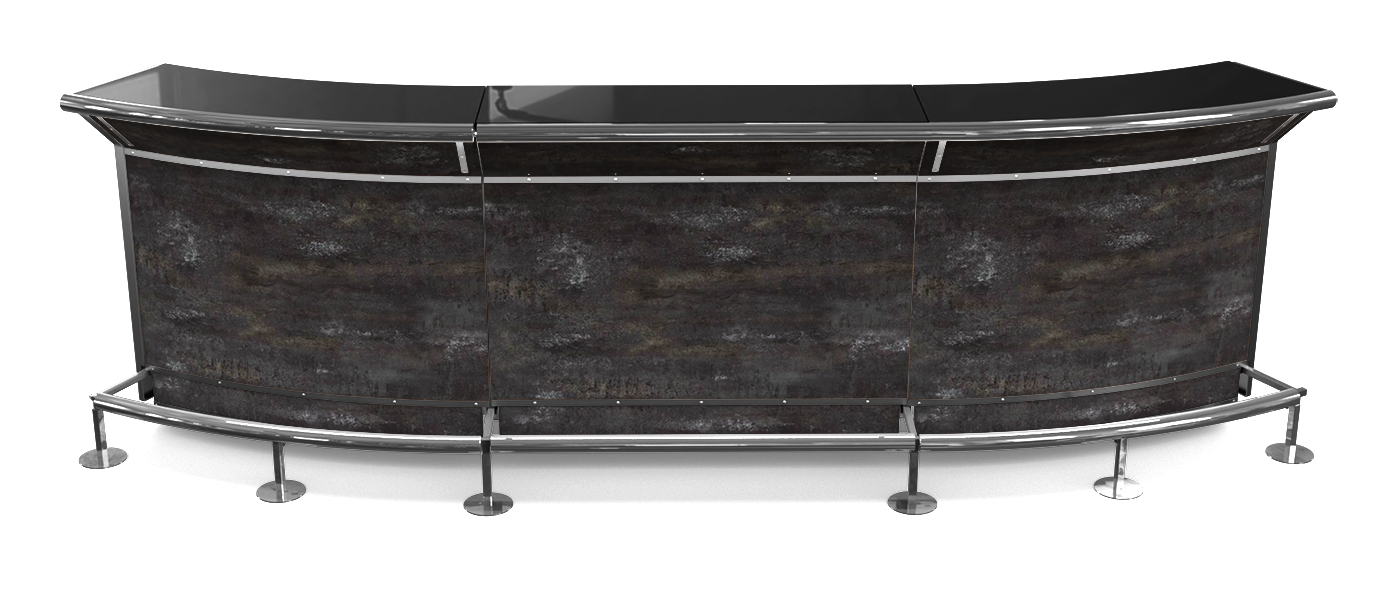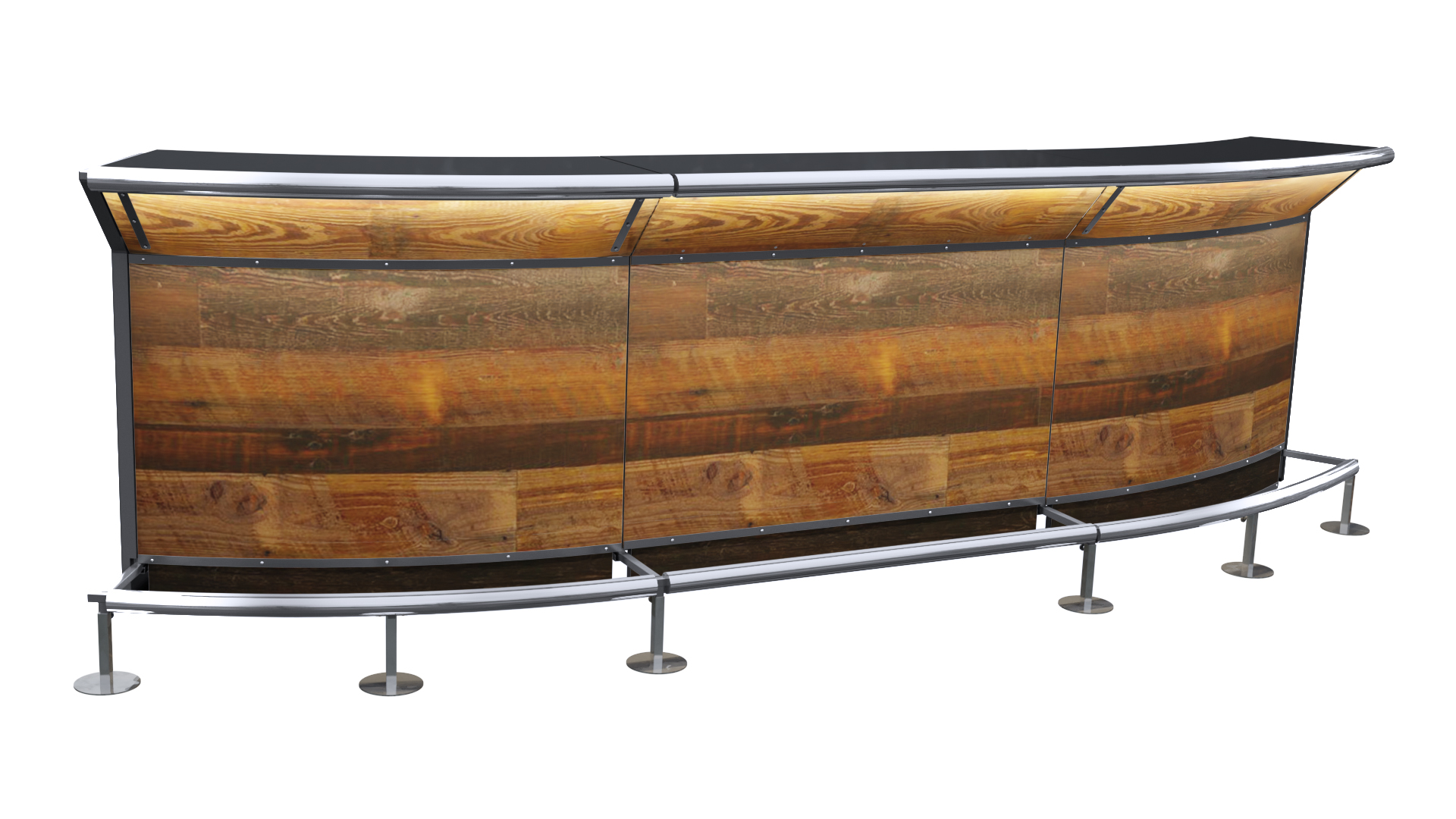 The Illuminated Slightly Curved Bar is meant to stand out. It is an unmissable 12 feet 3 inches long while the slight curve turns up the sophistication. It offers ample storage space and works well as a wine bar for weddings and corporate events.