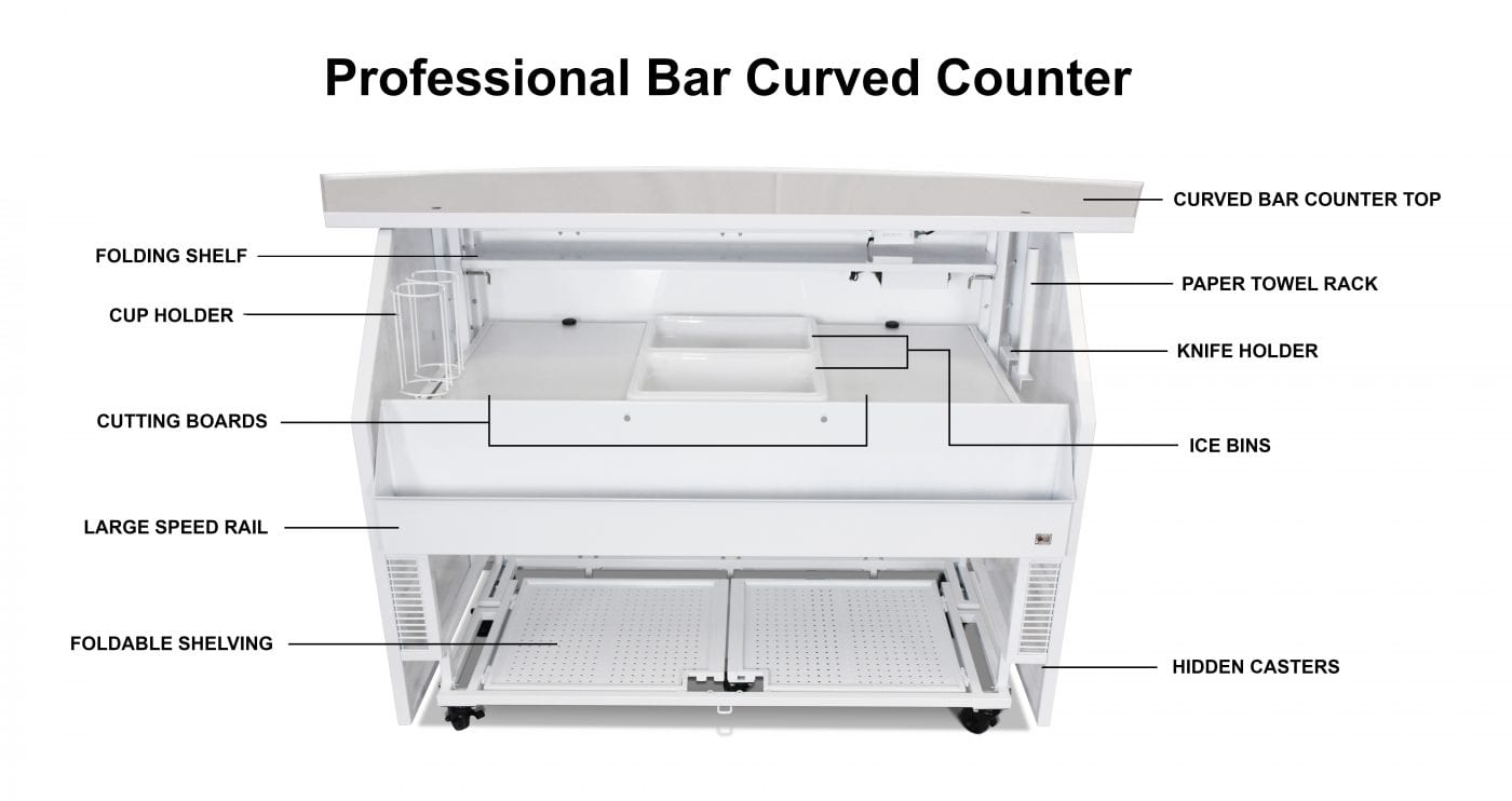 With conveniently placed ice bins, cutting boards, plenty of foldable shelving space, and a sunken speed well, you’ll have everything you need to focus less on organization on more on what matters. Our Professional Portable Bar also offers a cup holder, towel rack, knife holder, and enough storage space to hold up to 200 lbs of bar equipment and alcohol.