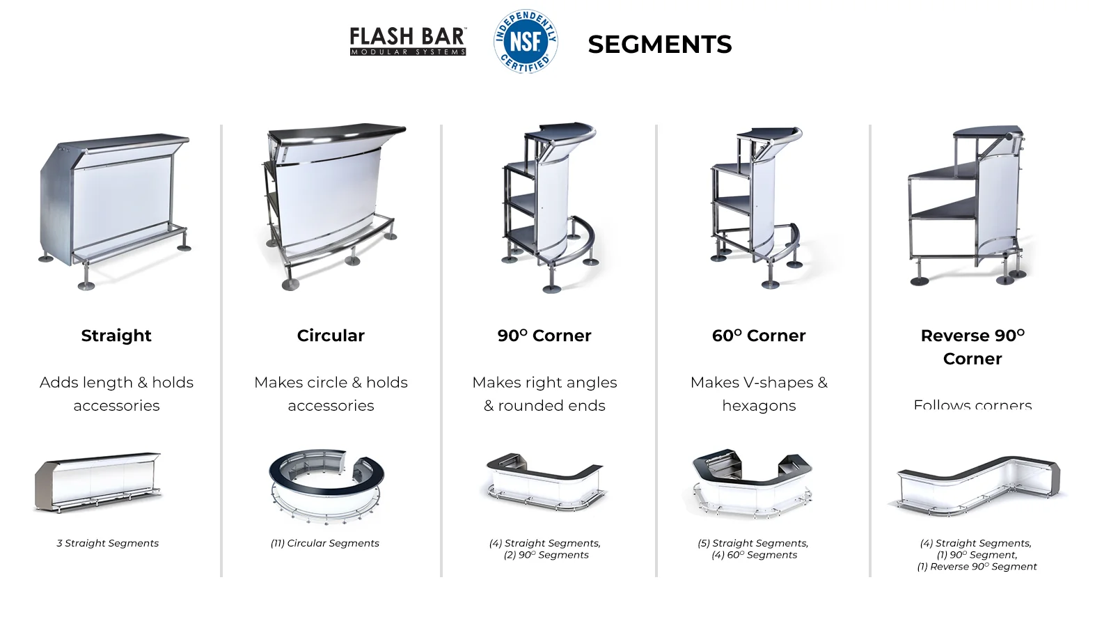 The NSF Flash Bar Straight Segment is the heart of the NSF-certified Flash Bar. This modular system offers segments and accessories to customize the size, shape, and functionality of your bar.