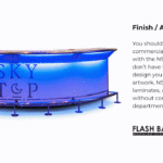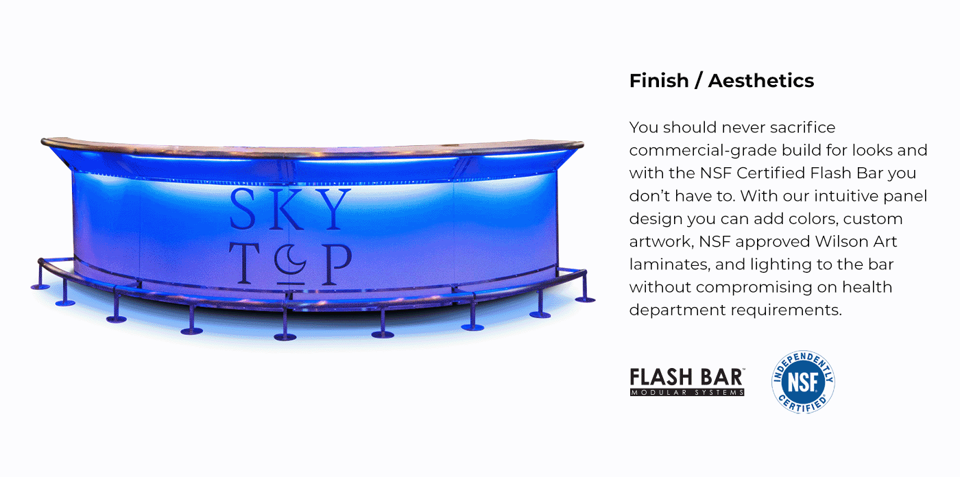 Finish / aesthetics: You should never sacrifice commercial-grade build for looks and with the NSF Certified Flash Bar you don’t have to. Our panel design supports adding colors, custom artwork, NSF-approved laminates, and lighting without compromising health standards. Review the artwork template