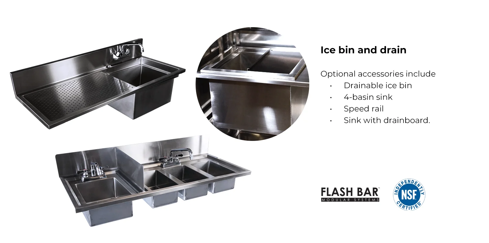 Ice bin and drain: Optional accessories include drainable ice bin, 4-basin sink, speed rail and sink with drainboard.