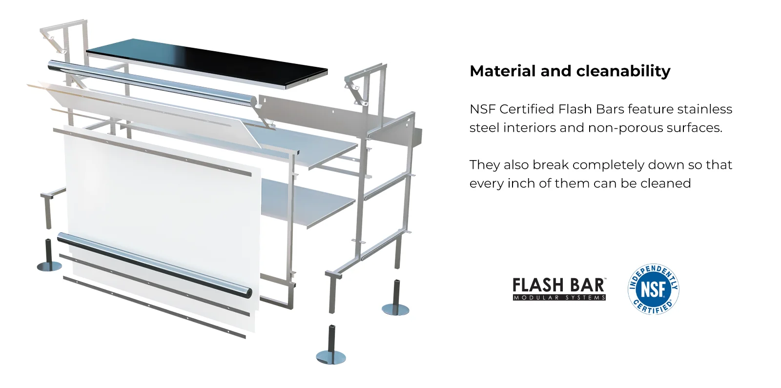 Material and cleanability: NSF Certified Flash Bars feature stainless steel interiors and non-porous surfaces. They also break completely down so that every inch of them can be cleaned. See the Maintenance & Care Guide