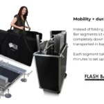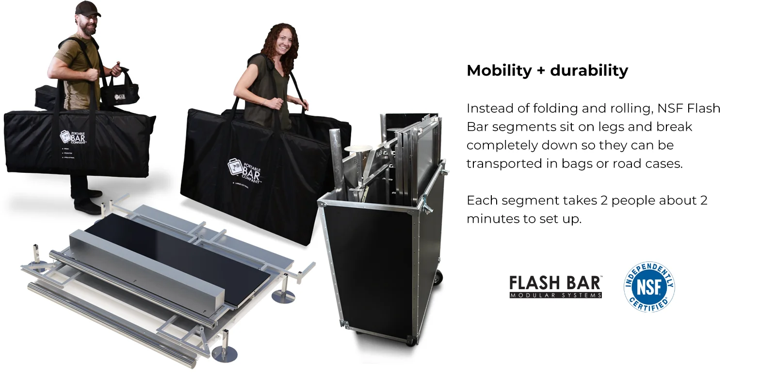 Mobility + durability: NSF Flash Bar segments rest on legs and completely break down rather than folding and rolling, allowing for transport in bags or road cases. Two people can set up each segment in about 2 minutes.