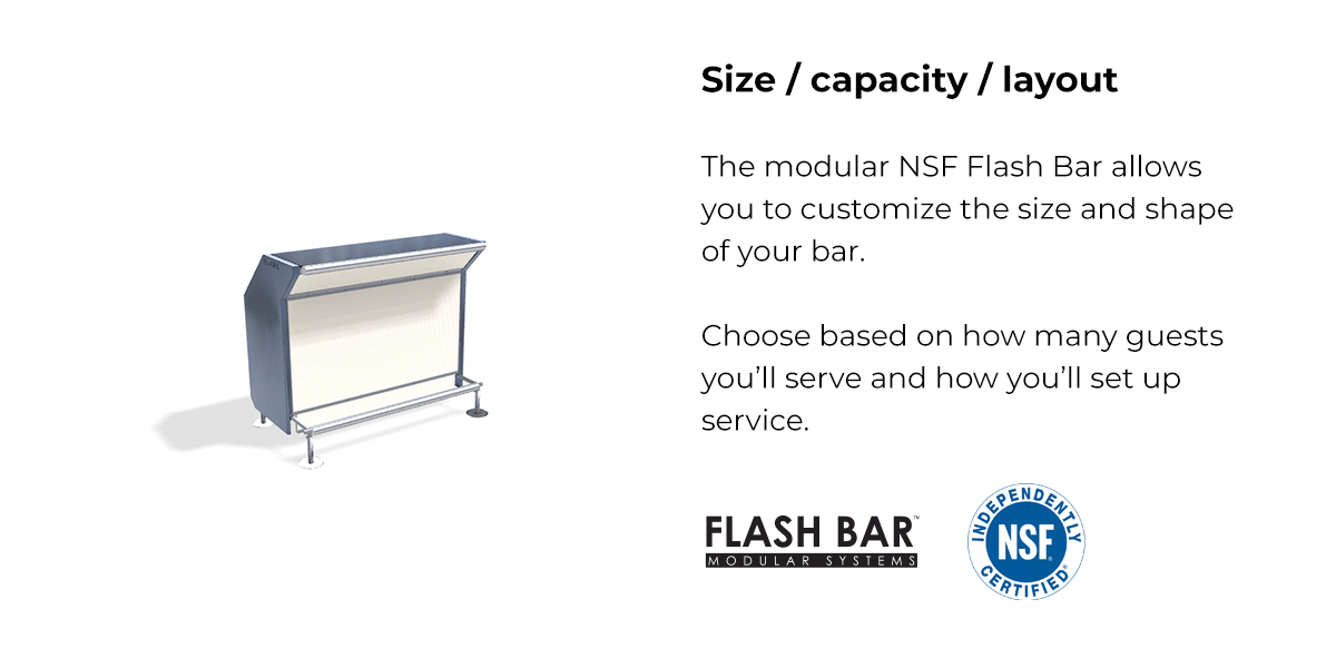 Size / capacity / layout: The modular NSF Flash Bar allows you to customize the size and shape of your bar. Choose based on how many guests you’ll serve and how you’ll set up service.
