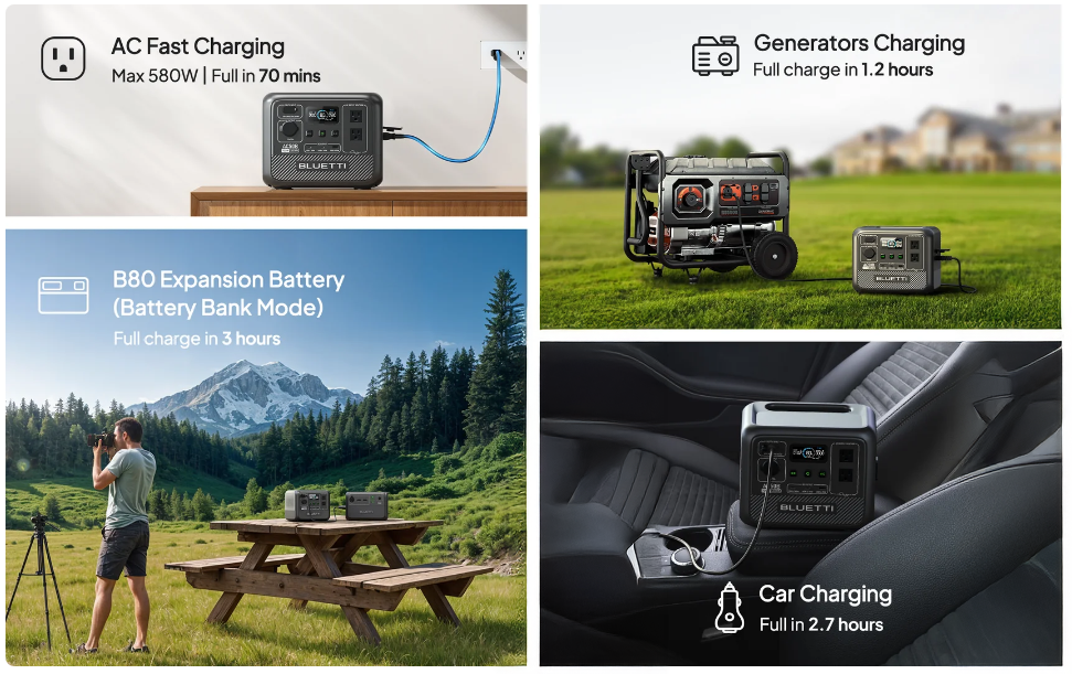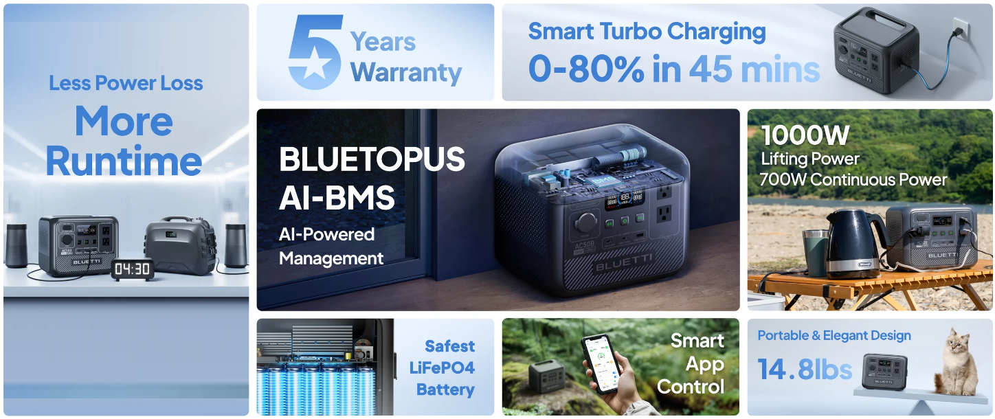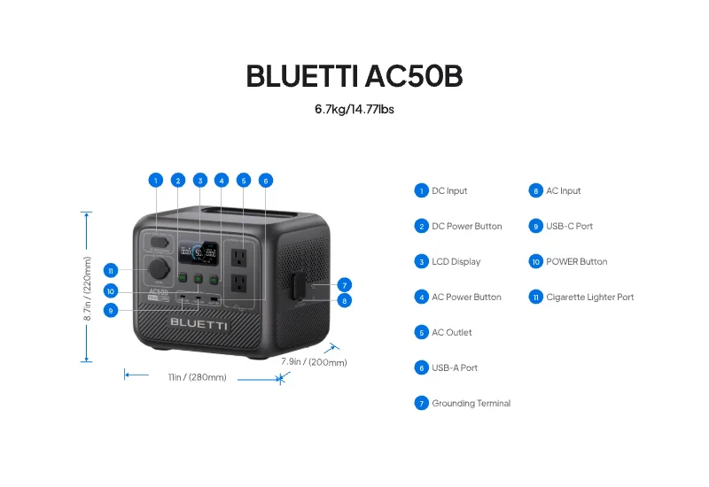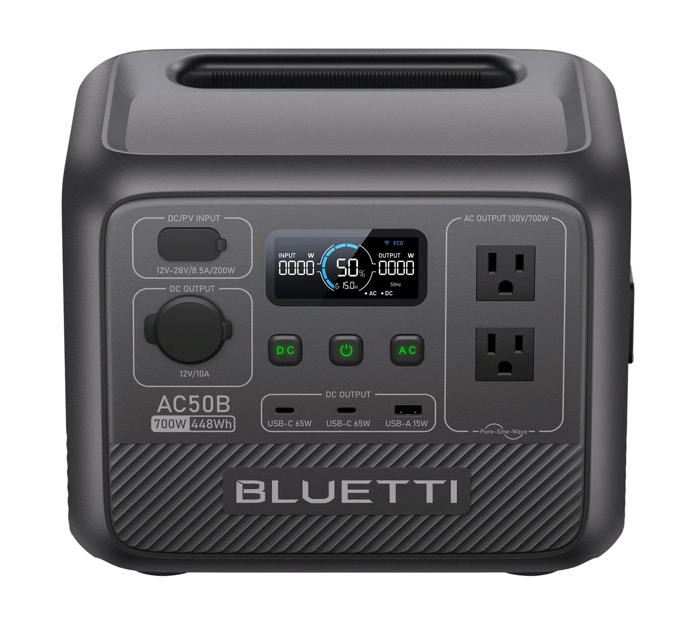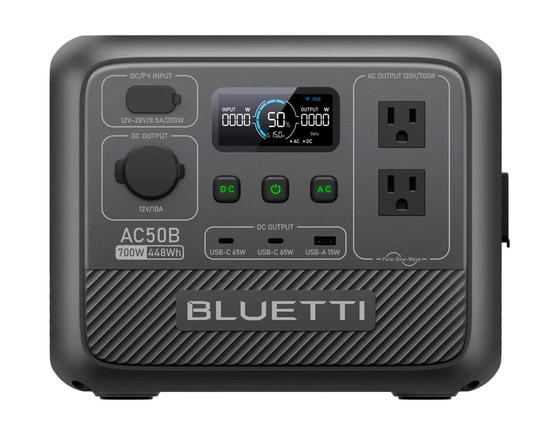 The Portable Power Station BLUETTI AC50B – 700W 448Wh features 448Wh capacity and 700W high power output, ensuring you have ample energy to run essentials. The advanced AI-BMS intelligent optimizes energy consumption, maximizing runtime and efficiency.