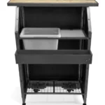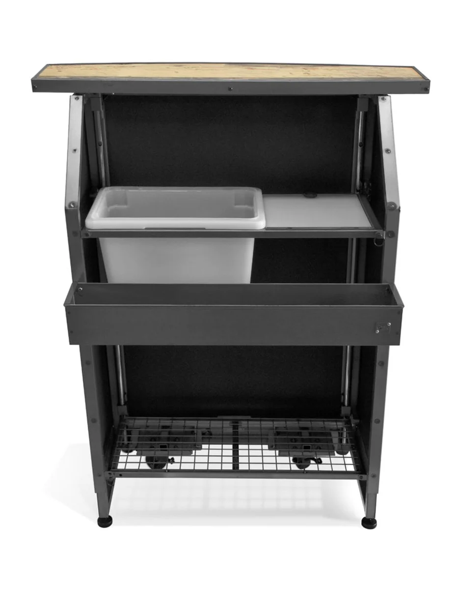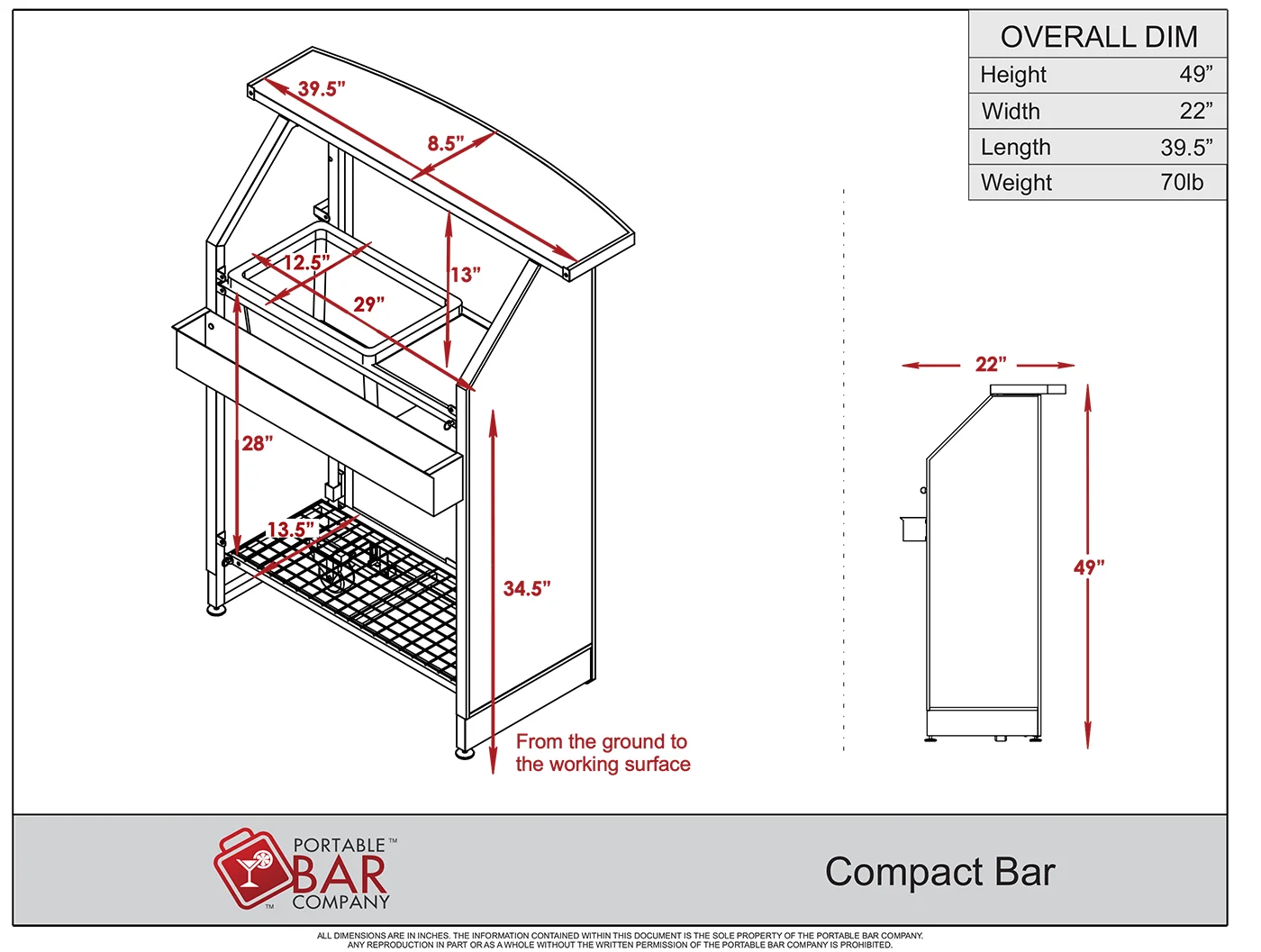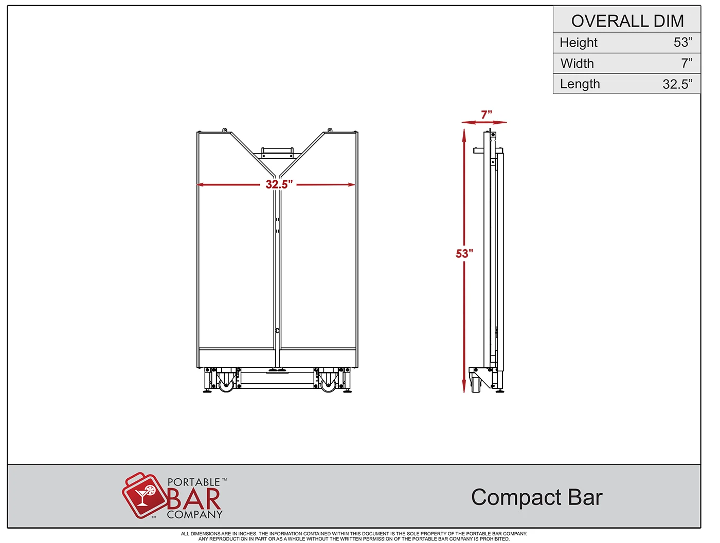 The Rustic Compact Bar rolls on industrial strength casters and can be set up and broken down in less than 2 minutes with no tools required. The sides and counters fold down and lock into place with spring latches. When broken down the bar is only 7” deep and small enough to fit in most mid-sized sedans. Included features with every Compact Bar are: a speed rail (fits 1-liter bottles), a protective canvas cover, 1 ice bin, and 1 cutting board.