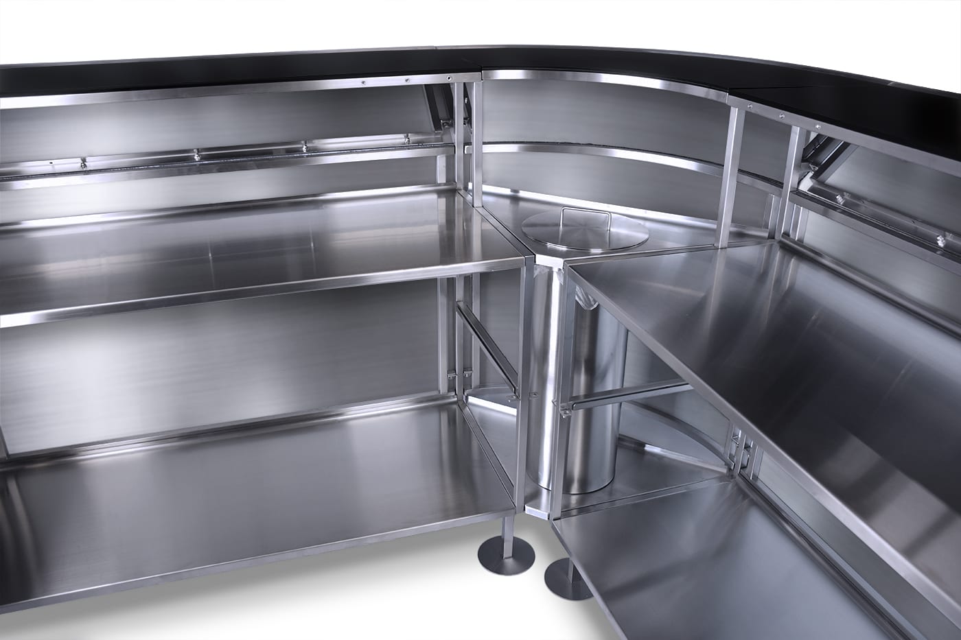 The Flash Bar Trash Chute makes the best use of often unused worktop space of the 90° Corner Segment. It fits into a special drop-in shelf that can be retrofitted into a Straight Segment or V2  90° Corner Segment. The drop-in style allows the Trash Chute to be installed in under a minute and helps secure a 13 gallon (kitchen size) or larger trash bag.